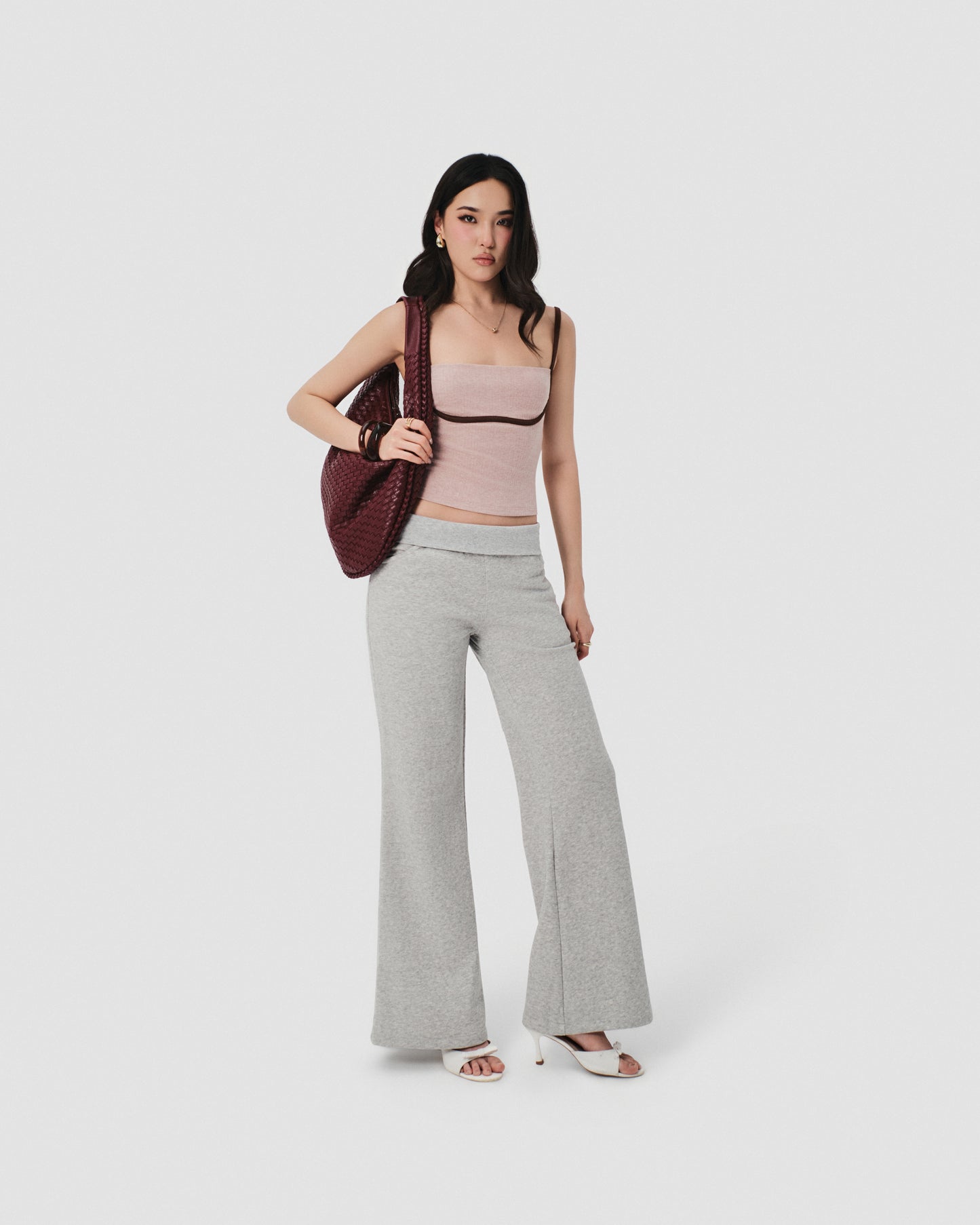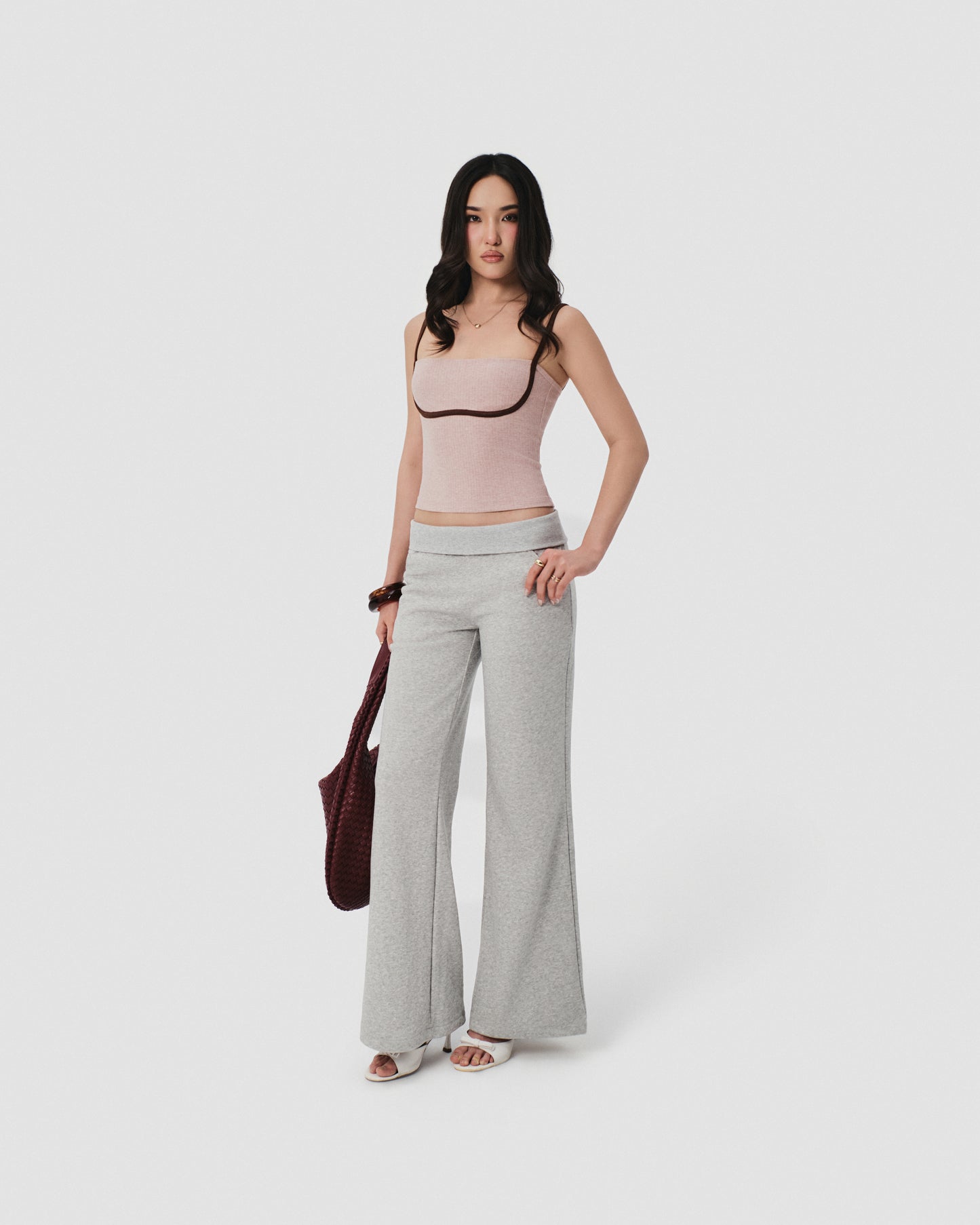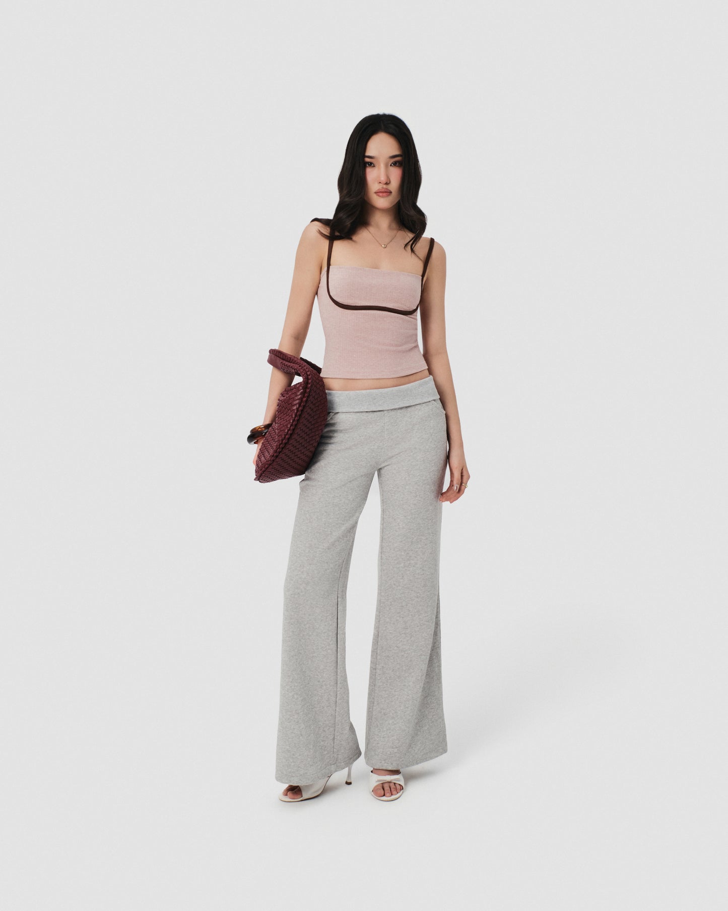 Color: Pastel Pink with Brown Trim Material: Ribbed Knit with Suede Straps Fit: Slim Fit Model wears: Size S Made in Vietnam