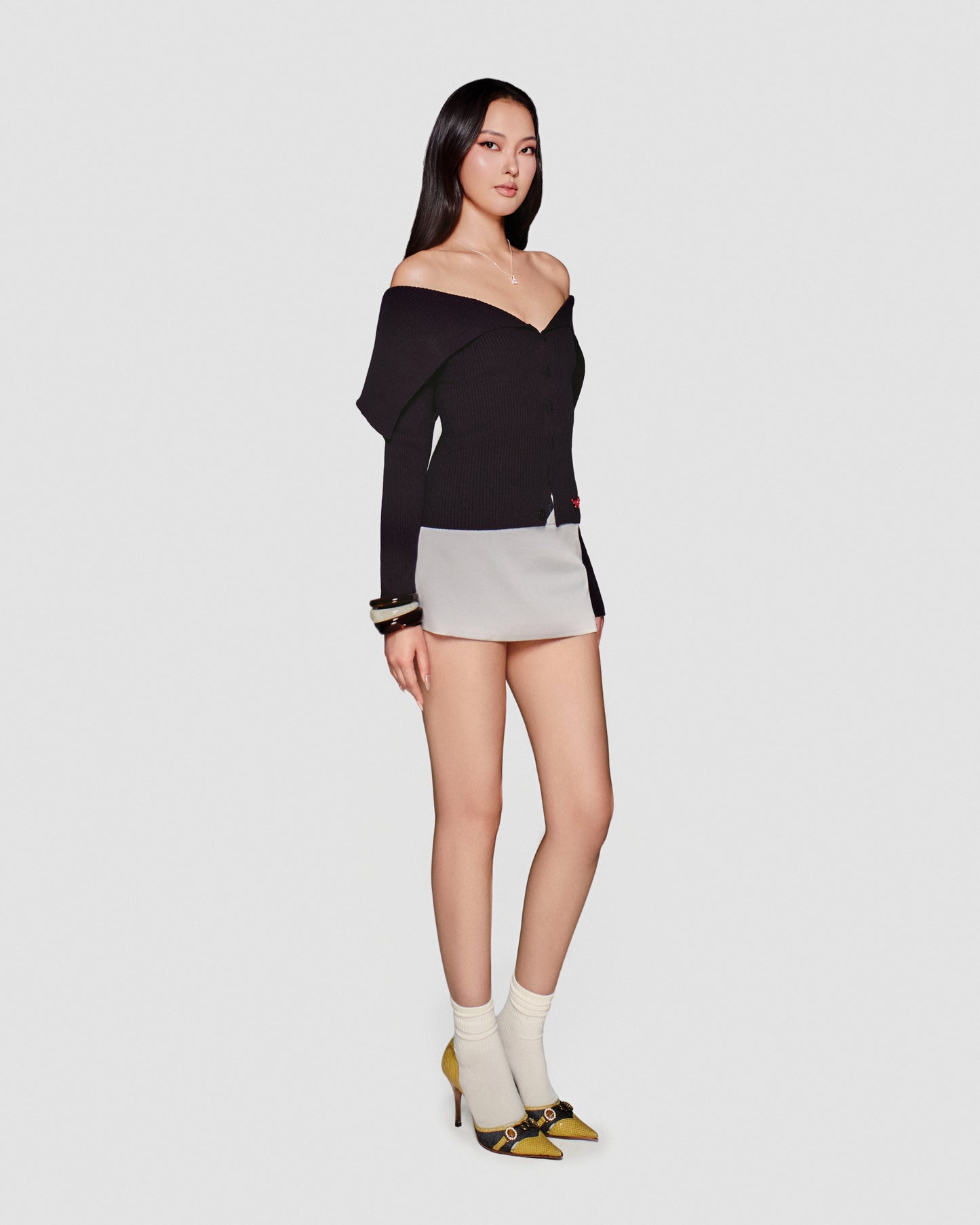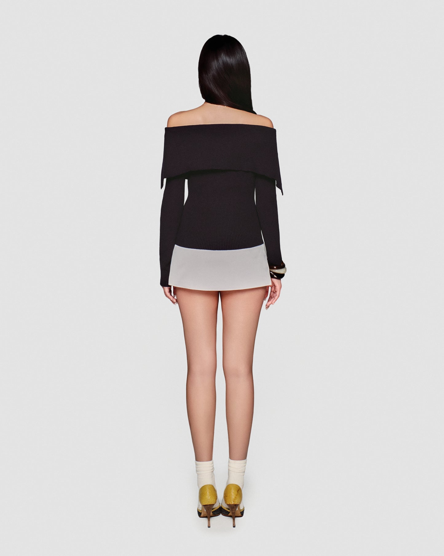 • Long-sleeve knit top with off-shoulder layered neckline as a design highlight