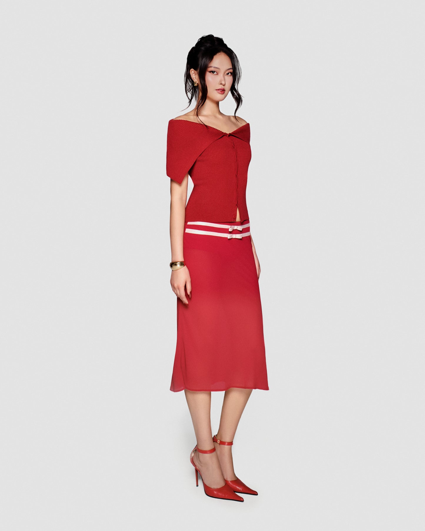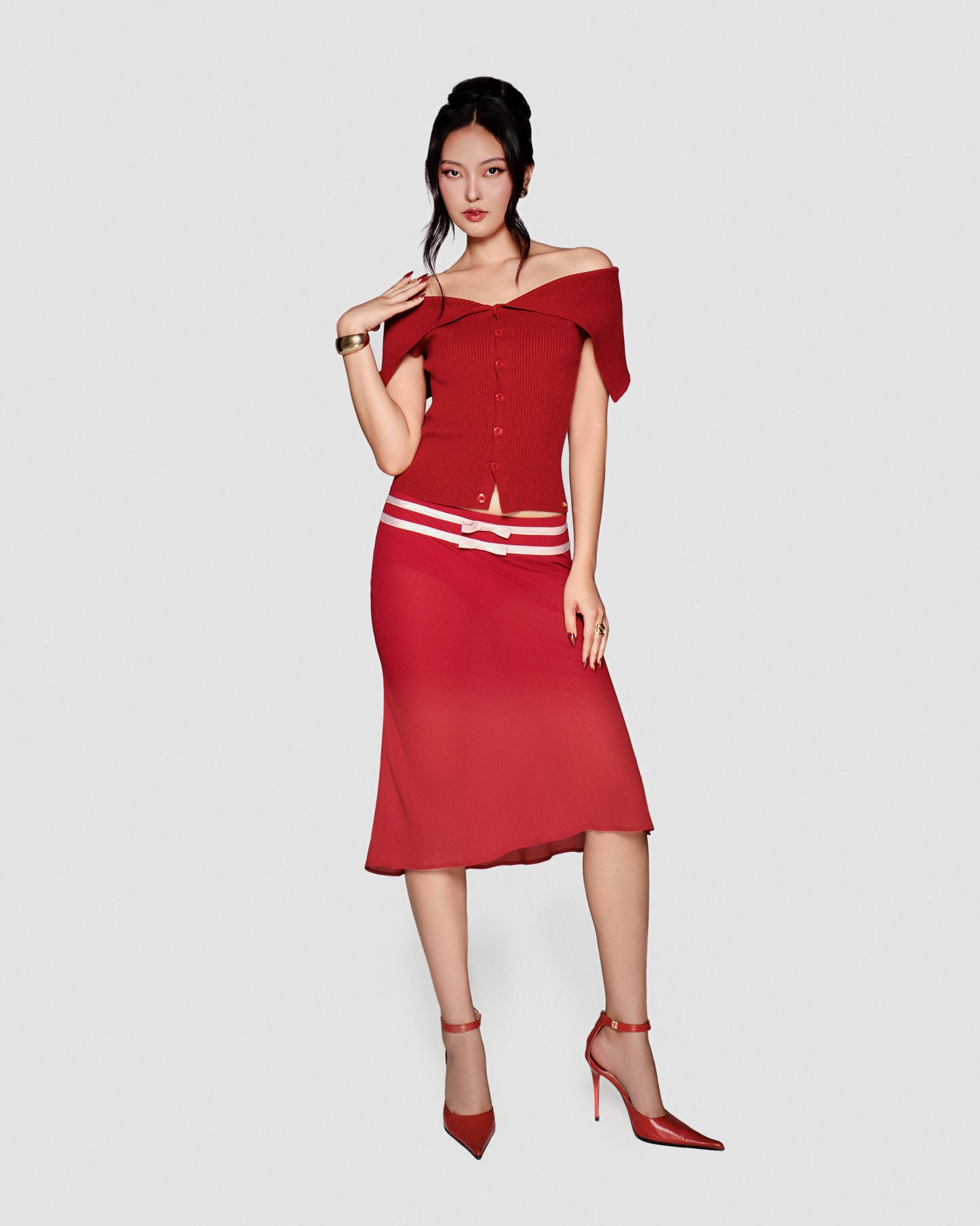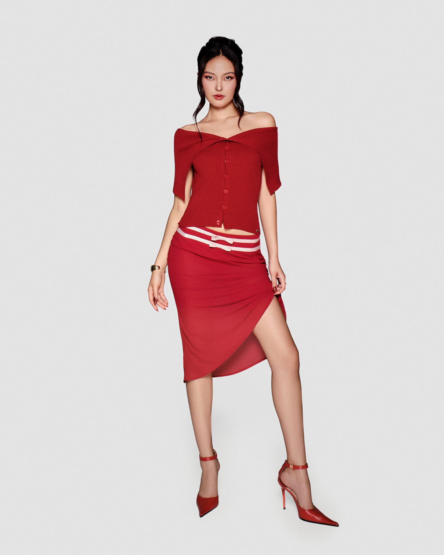 • Chân váy maxi xuyên thấu với cạp phối màu nổi bật
