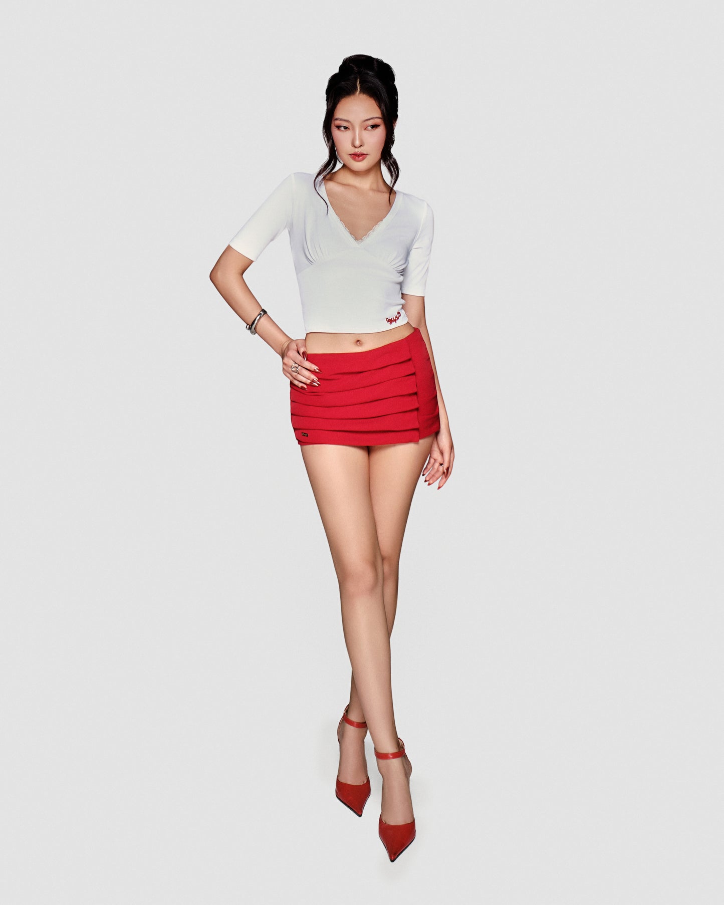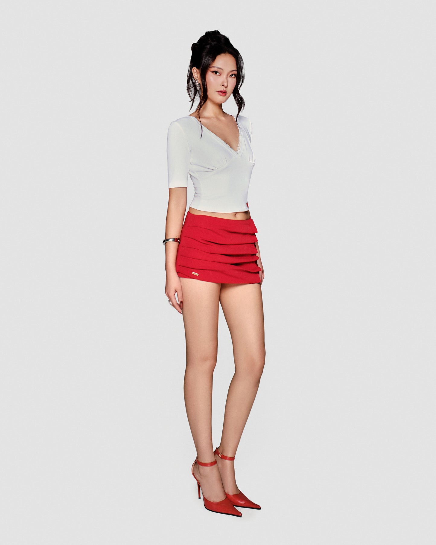 • Chân váy ngắn với thiết kế xếp tầng draping nổi bật
